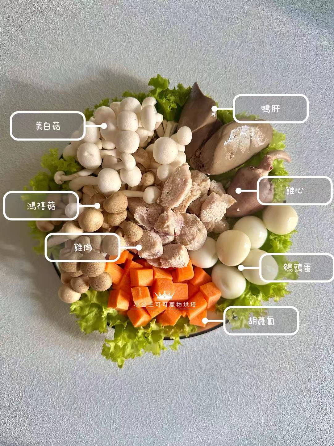 成分:雞肉、鵪鶉蛋、雞心、鴨肝、鴻禧菇、美白菇、胡蘿蔔