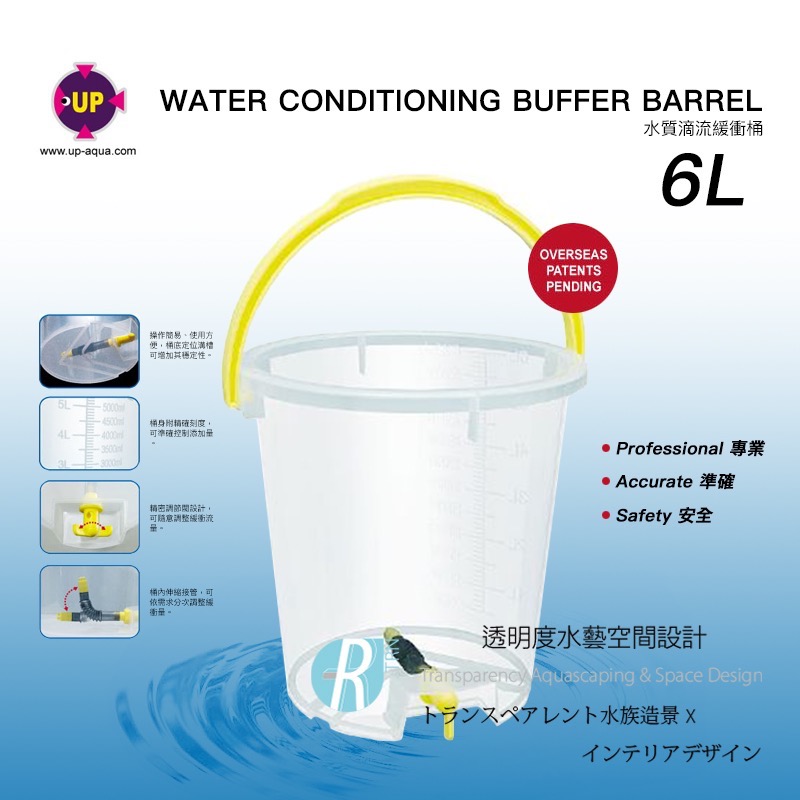 .魚缸換新水時,可將新水先放入緩衝桶內,再將水質穩定劑或其他處理劑適量倒入緩中桶內再調整調節閥流量,使其緩慢流入缸內,讓魚兒不會感受到水質及水溫的急遽變化,使緊迫性降至最低。