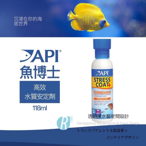 API STRESS COAT水調節劑通過去除自來水中的氯、氯胺和重金屬,使自來水對魚類安全,並含有蘆薈的治愈能力,可將魚類的壓力降低多達40%,並治愈受損的組織和傷口。