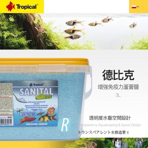 Sanital是一種添加了蘆薈的水族鹽,用於在魚體狀況惡化期間準備浴液,例如運輸後、適應環境期間、魚體表面發現皮膚缺陷等、大量飲水後。