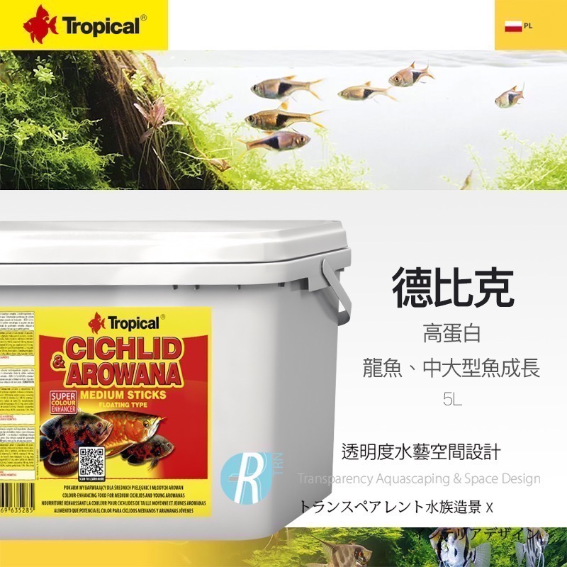 慈鯛和龍魚中型棒是一種多成分的漂浮棒形式的增色食品,旨在用於中型慈鯛和幼龍魚的雜食性和肉食性物種的日常餵養。