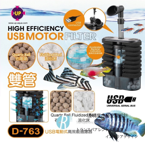 利用USB水中馬達形成水流,以達到吸附雜質和培養硝化菌的功能。