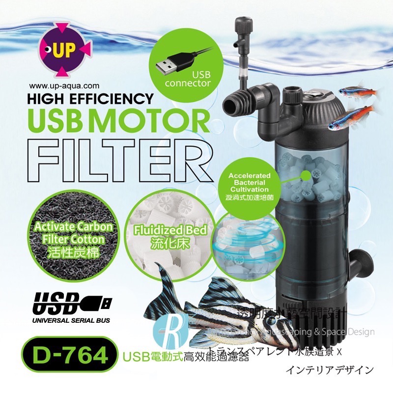 利用USB水中馬達形成水流,以達到吸附雜質和培養硝化菌的功能。