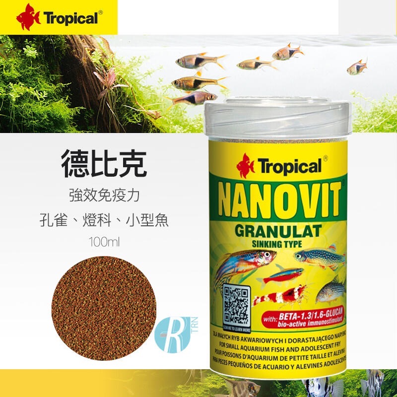 Nanovit Granulat非常適合小型觀賞魚的食物,例如:阿曼達普通魚(Hyphessobrycon amandae )、金鷸(Hemigrammus rodwayi)、婆羅洲斑鷸(Baras brigittae)、斑點斑魚鷸(Boraras maculatus)、英內斯虹魚虹魚紅(Paracheirodon innesi)、矮人胸甲(Corydoras pygmaeus),以及青少年胸甲、炒。