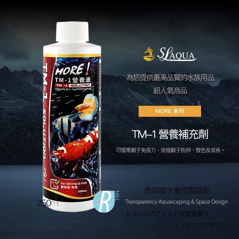 TM-1營養液可降低金屬離子毒性帶給水草傷害,增加植物養份吸收能力;並可分解缸內底床有害物質,可提高蝦子免疫力,促進蝦子抱卵、發色及成長。
