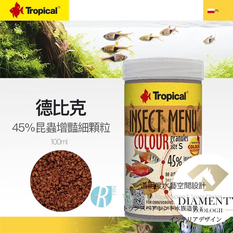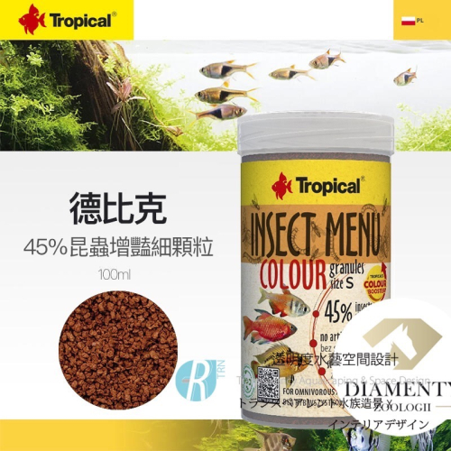雜食性和肉食性水族館魚類的下沉顆粒增色食品,以3種昆蟲為基礎:水虻(15%)、蠶(15%)和黃粉蟲(15%),採用Tropical的Colour Booster配方。