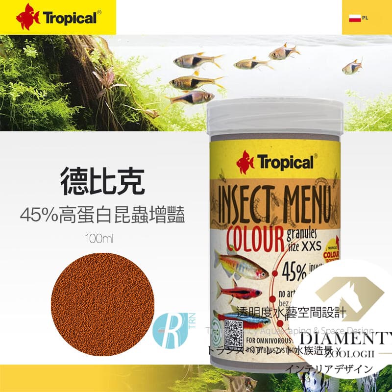 為雜食性和肉食性水族館魚類提供下沉式、極細顆粒的增色食品,以3種昆蟲為基礎:水虻(15%)、蠶(15%)和黃粉蟲(15%),採用Tropical的Colour Booster配方。