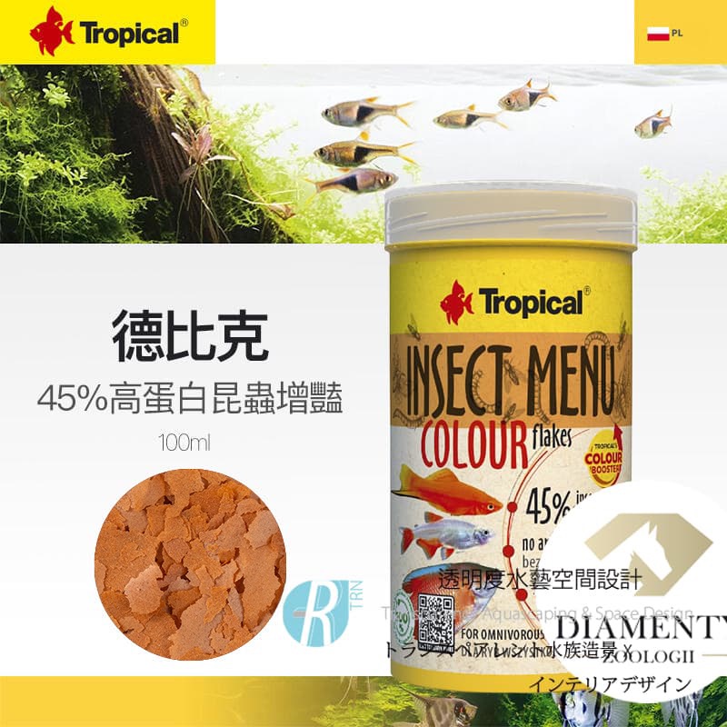 雜食性和肉食性水族箱魚類的增色薄片食物,以3種昆蟲為基礎:水虻(15%)、蠶(15%)和黃粉蟲(15%),採用Tropical的Colour Booster配方。