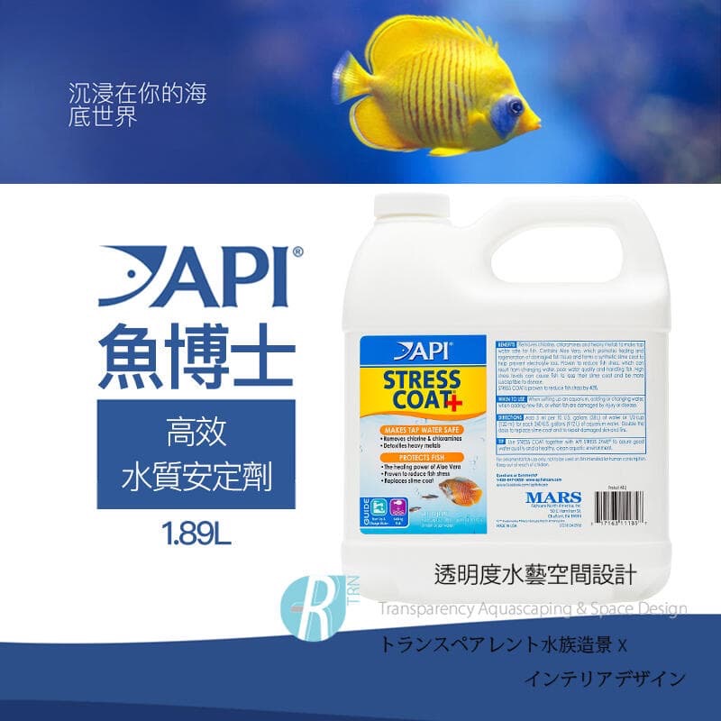 API STRESS COAT水調節劑通過去除自來水中的氯、氯胺和重金屬,使自來水對魚類安全,並含有蘆薈的治愈能力,可將魚類的壓力降低多達40%,並治愈受損的組織和傷口。