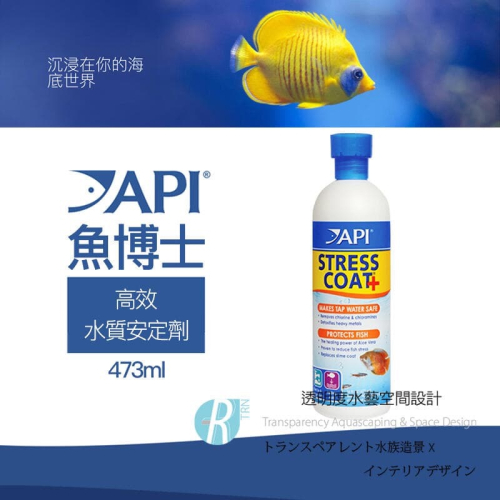 API STRESS COAT水調節劑通過去除自來水中的氯、氯胺和重金屬,使自來水對魚類安全,並含有蘆薈的治愈能力,可將魚類的壓力降低多達40%,並治愈受損的組織和傷口。