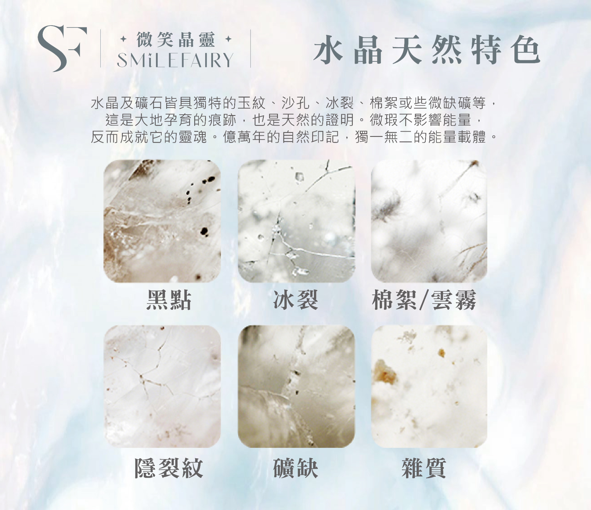 每顆水晶都是大地獨一無二的藝術品,天然形成的冰裂紋、棉絮與礦缺正是它們最真實的生命印記。若您追求完美無瑕,建議選購前慎重考慮喔~