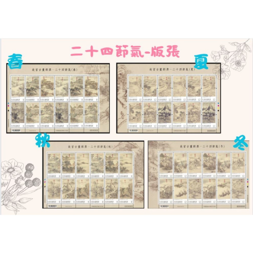 第4套「夏」,含立夏、小滿、芒種、夏至、小暑、大暑6枚郵票圖案,面值均為12元,以聯刷方式印製,每枚郵票長邊中間有1個異形齒孔。《墨妙珠林》為清乾隆時期的巨幅冊頁集,全套共有12冊,以地支編號,卯冊為張若靄所繪二十四節氣圖,其詮釋節氣的方式以山水圖案為主軸,有透過古代大家風格表現當令氣候,或有點綴應時的風俗活動、自然界動植物生態,呈現不同節氣景物的變化。