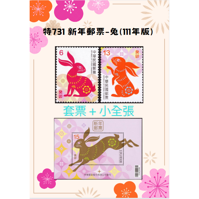 一、面值6元郵票:靜坐的兔子象徵靜待與期盼,迎接新年新希望。二、面值13元郵票:翹首遠盼的兔子象徵期許未來,祝福新年心想事成。三、面值15元小全張:躍動的兔子,象徵活力與生機,祈願新年鴻「兔」大展,前程似錦。