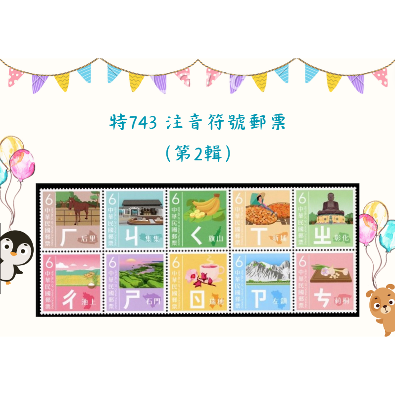 第2輯「ㄏ、ㄐ、ㄑ、ㄒ、ㄓ、ㄔ、ㄕ、ㄖ、ㄗ、ㄘ」結合行政區地圖及當地特色為設計,規劃郵票1套10枚,面值均為6元,採聯刷方式印製,圖案簡介如下: 一、ㄏ:后里、馬場。二、ㄐ:集集、集集車站。三、ㄑ:旗山、香蕉。四、ㄒ:新埔、柿餅。五、ㄓ:彰化、大佛。六、ㄔ:池上、稻米。七、ㄕ:石門、老梅綠石槽。八、ㄖ:瑞穗、洛神花。九、ㄗ:左鎮、草山月世界。十、ㄘ:莿桐、蒜。