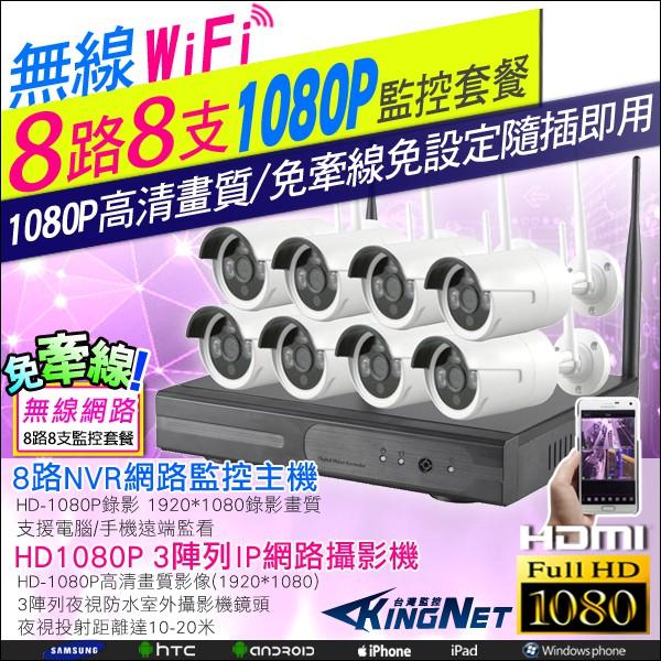 F【無名】監視器 8路8支 套餐 WIFI 1080P 防水槍型 紅外線夜視 手機遠端 防剪線支架 監控設備