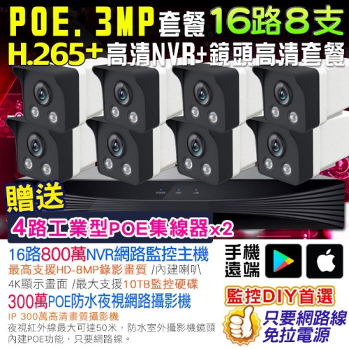 F【無名】監視器 16路 8支 監控套餐 紅外線夜視 NVR IP 網路攝影機 300萬 遠端 POE 含稅 TO