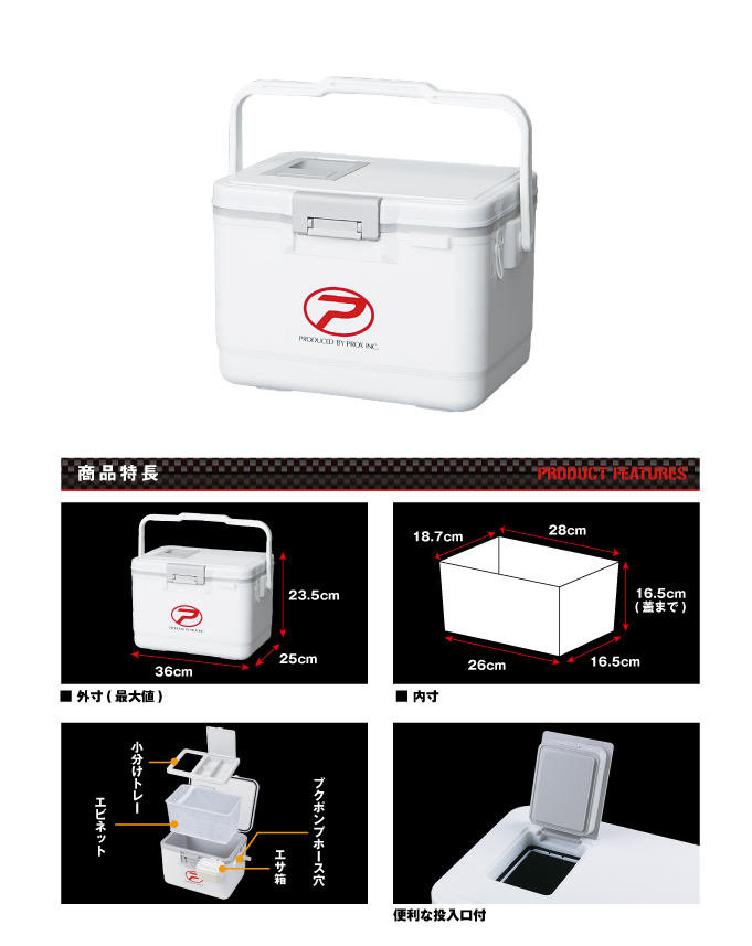 • 專攻遠投、海釣場、活蝦蟲餌使用釣場、而改良的多功能中型10公升小型活蝦保冷冰箱。