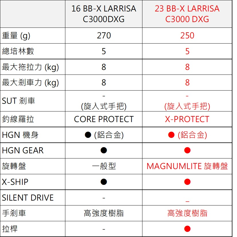 LARRISA突破初階機種傳統框架後嶄新登場,是一款高性能手煞車捲線器。為了實現高剛性和耐久性,特別採用HAGANE齒輪和HAGANE機身。此外,更配備MAGNUMLITE旋轉盤,釣線在逆轉時能順暢出線。
