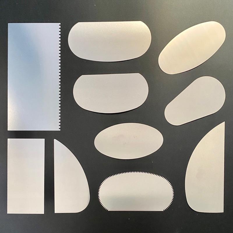 尺寸 : 1. 鋸齒大型刮片 - 14x7cm 2. 長方形刮片 - 10x5cm 3. 小三角刮片 - 9.7x4.7cm 4. 大三角刮片 - 12x5cm 5. 大型半橢圓刮片 - 11x5.1cm 6. 小型半橢圓刮片 - 10x5.1cm 7. 鋸齒半橢圓刮片 - 10x5.1cm 8. 大型橢圓刮片 - 9.7x4.7cm 9. 小型橢圓刮片 - 9.2x4.7cm 10. 水滴刮片 - 8.5x5cm