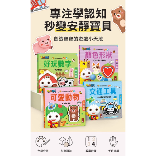 找一找,貼一貼,帶孩子認識顏色和形狀!本書附五張圖卡,根據文字提示和形狀輪廓,讓孩子動手黏貼配對,學習顏色和形狀,不僅能促進認知能力,也增加學習 的趣味性,讓孩子印象更深刻!