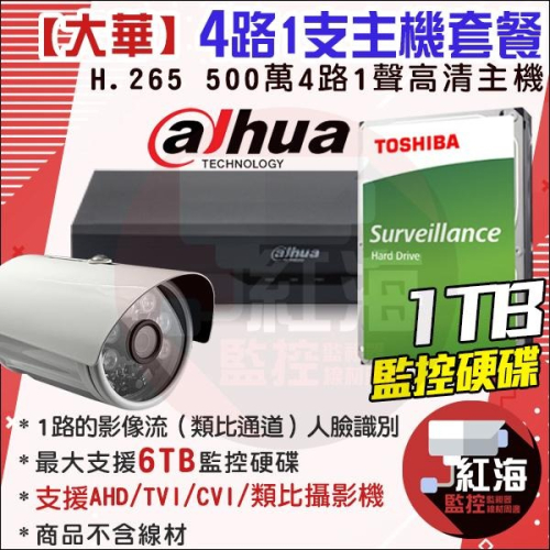 【紅海監控】大華 4路1支主機套餐 H.265 500萬 監控主機 4路DVR 1TB 硬碟 DH-XVR5104