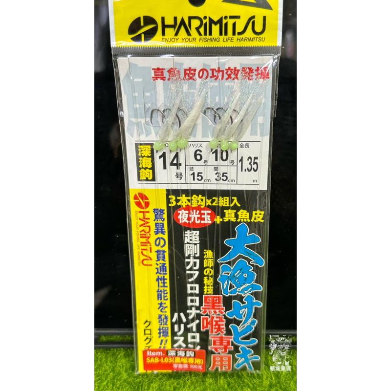 【 頭城東區釣具 】HARIMITSU 泉宏 深海鉤 黑喉仕掛 魚皮鉤 SAB-L03 夜光珠+真魚皮 船釣連鉤 串鉤