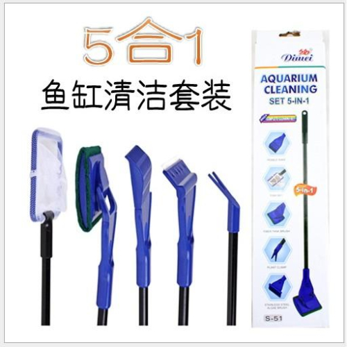 5合1魚缸清潔套裝 清潔套裝帶給你全新的體驗,無需弄濕雙手,就可以簡單便捷地清潔魚缸。 附帶的5種配件,魚撈,沙漏耙藻類刷水草夾缸刷,使魚缸清潔維護變得越來越簡便。 為滿足不同的清潔要求,您可以根據需要更換手柄上的清潔配件,更換也非常方便。 總尺寸約60CM長。