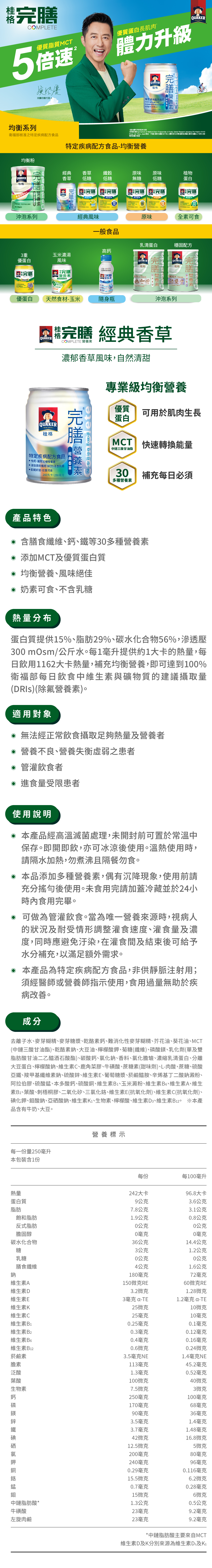 去離子水、麥芽糊精、麥芽糖漿、乾酪素鈣、難消化性麥芽糊精、芥花油、葵花油、MCT(中鏈三酸甘油酯)、乾酪素鈉、大豆油、檸檬酸鉀、菊糖(纖維)、磷酸鎂、乳化劑(單及雙脂肪酸甘油二乙醯酒石酸酯)、碳酸鈣、氯化鈉、香料、氯化膽生僉、濃縮乳清蛋白、分離大豆蛋白、檸檬酸鈉、維生素C、鹿角菜膠、牛磺酸、蔗糖素(甜味劑)、L-肉酸、蔗糖、硫酸亞鐵、羧甲基纖維素鈉、硫酸鋅、維生素E、葡萄糖漿、菸鹼醯胺、辛烯基丁二酸鈉澱粉、阿拉伯膠、硫酸錳、本多酸鈣、硫酸銅、維生素B1、玉米澱粉、維生素B6、維生素A、維生素B2、葉酸、刺梧桐膠、二氧化矽、三氯化鉻、維生素E(抗氧化劑)、維生素C(抗氧化劑)、碘化鉀、鉬酸鈉、亞硒酸鈉、維生素K1、生物素、檸檬酸、維生素D3、維生素B12。本產品含有牛奶、大豆。 |