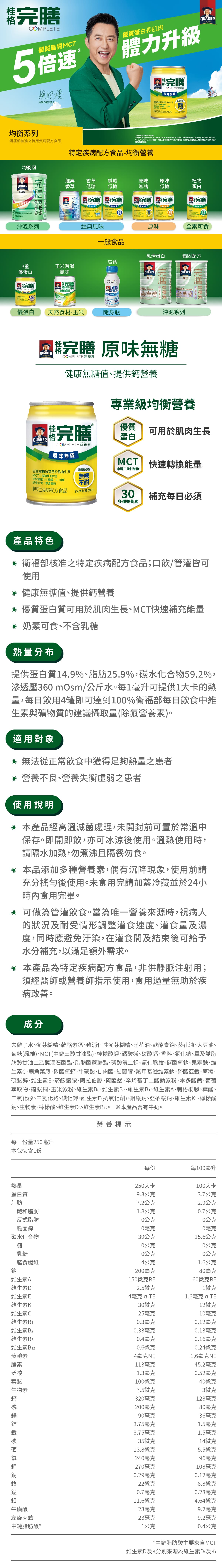 去離子水、麥芽糊精、乾酪素鈣、難消化性麥芽糊精、芥花油、乾酪素鈉、葵花油、大豆油、菊糖(纖維)、MCT(中鏈三酸甘油酯)、檸檬酸鉀、磷酸鎂、碳酸鈣、香料、氯化鈉、單及雙脂肪酸甘油二乙醯酒石酸酯、脂肪酸蔗糖酯、磷酸氫二鉀、氯化膽生僉、碳酸氫鈉、果寡醣、維生素C、鹿角菜膠、磷酸氫鈣、牛磺酸、L-肉酸、結蘭膠、羧甲基纖維素鈉、硫酸亞鐵、蔗糖、硫酸鋅、維生素E、菸鹼醯胺、阿拉伯膠、硫酸錳、辛烯基丁二酸鈉澱粉、本多酸鈣、葡萄萃取物、硫酸銅、玉米澱粉、維生素B6、維生素B2、維生素B1、維生素A、刺梧桐膠、葉酸、二氧化矽、三氯化鉻、碘化鉀、維生素E(抗氧化劑)、鉬酸鈉、亞硒酸鈉、維生素K1、檸檬酸鈉、生物素、檸檬酸、維生素D3、維生素B12。本產品含有牛奶。 |