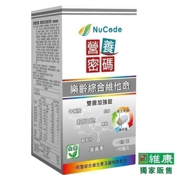 內容物名稱:碳酸鈣、麥芽糖粉末、葡萄糖酸鋅、維生素E (維生素E、蔗糖、辛烯基丁二酸鈉澱粉、玉米澱粉、水、矽鋁酸鈉)、氧化鎂、維生素 C (維生素C、玉米澱粉)、牛磺酸、酵母(啤酒酵母、三氯化鉻)、膜衣成分(羥丙基甲基纖維素、二氧化鈦、微結晶狀 -纖維素、硬脂酸)、丁烯二酸亞鐵、羧甲基澱粉鈉、羥丙基纖維素、二氧化矽、硒酵母、葡萄糖酸錳、菸鹼醯胺、葡萄籽萃取物(葡萄籽萃取物、麥芽糊精)、硬脂酸鎂、10%葉黃素(辛烯基丁二酸鈉澱粉、葡萄糖漿、蔗糖、葉黃素、維生素C、水)、葡萄糖酸銅、鉬酵母、本多酸鈣、肌醇、維生素A (蔗糖、玉米澱粉、阿拉伯膠、維生素A、水、維生素E(抗氧化劑)、磷酸鈣)、重酒石酸膽鹼 (重酒石酸膽鹼、二氧化矽)、穀胱甘肽、維生素B6、維生素D3 (辛烯基丁二酸鈉澱粉、蔗糖、維生素C (抗氧化劑)、中鏈三酸甘油酯、二氧化矽、維生素E(抗氧化劑)、維生素 D3)、維生素B1、維生素B2、維生素K1(阿拉伯膠、維生素K1、蔗糖)、葉酸、氧化鐵、維生素B12、生物素。