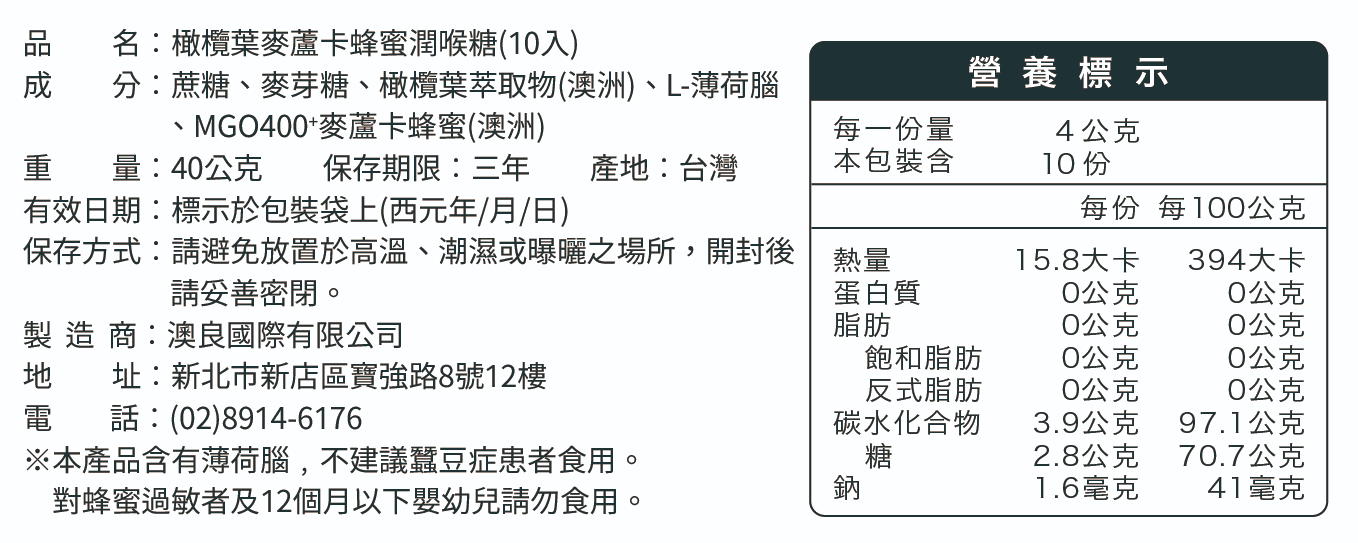 內容物名稱:蔗糖、麥芽糖、橄欖葉萃取物(澳洲)、L-薄荷腦、MGO400+麥蘆卡蜂蜜(澳洲)。