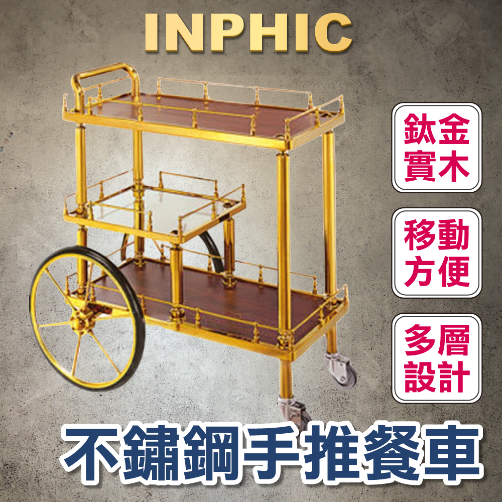 INPHIC-飯店 歐式實木移動酒水車 推車甜點車 營業用手推車 實木手推三層服務車 鈦金酒水車-INFA0171G4A
