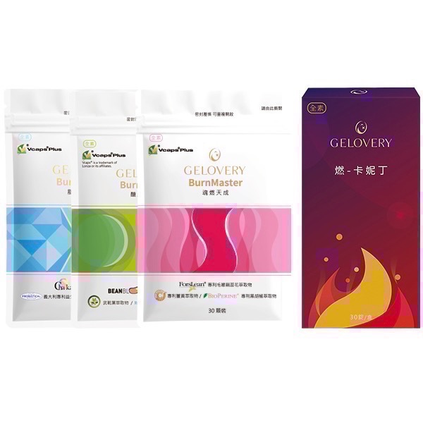 【Gelovery 脂包不住我(全素/阻油)】 哺乳可以吃,孕婦不要吃。 餐前15分鐘吃兩顆,一天最多四顆,看飲食情況。 專利魔芋 500mg、專利山茶花 50mg、專利仙人掌 20mg、專利益生菌 20mg 【Gelovery 醣絆不了我(全素/阻醣)】 哺乳可以吃,孕婦不要吃 餐前15分鐘吃兩顆,一天最多四顆,看飲食情況。 阻糖膠囊單顆的成分 專利山苦瓜 140mg 綠咖啡豆萃取物 100mg 武靴葉萃取物 100mg 高單位專利白腎豆 50mg 桑葉萃取物 50mg 專利玫瑰花瓣 25mg 鉻酵母 25mg 【Gelovery 魂燃天成(全素/燃燒代謝)】 哺乳可以吃,孕婦不要吃 餐後一小時內吃兩顆,一天最多四顆,看飲食情況 專利毛喉鞘蕊 250mg 專利薑黃素 125mg 瓜拿納萃取物 75mg 專利褐藻素 25mg 專利辣椒素 12.5mg 專利黑胡椒 3mg 【Gelovery 燃-卡妮丁錠】30錠/盒 (全素) 每日2次,每次2錠 餐後或運動前搭配開水食用 一日勿超過4錠。 L-肉酸 每顆500mg 還原型Q10 每顆含7.5mg(純量) InnoSlim黃耆三七 每顆62.5mg