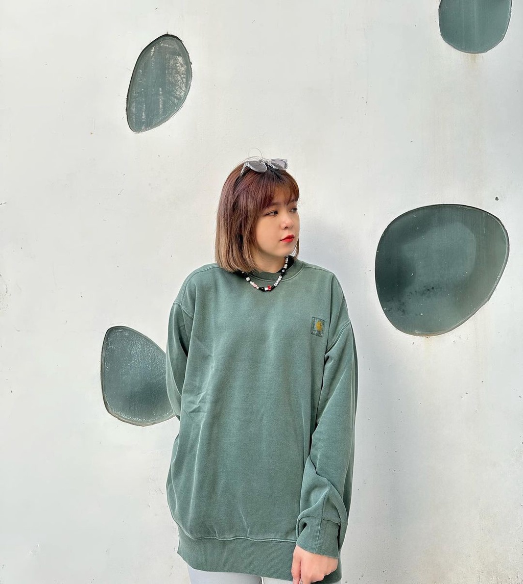 採用重量級拉絨棉針織面料製成 ,衣服經過顏料染色,顏色更深、更有質感,帶有額外的絎縫和襯墊。 這件單品採用醒目的“氣球版型”,略微寬鬆和四四方方,但也有落肩和羅紋袖口的特點。
