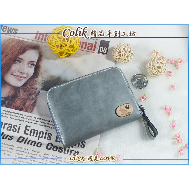 【愛麗絲手創坊】灰色牛皮+紫羅蘭色拉鍊_三格收納皮夾_零錢包_萬用卡包_證件名片夾_純手作