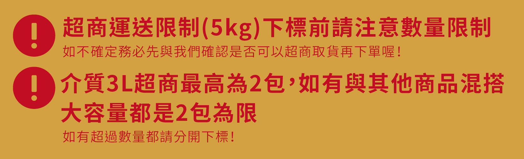 【超商有重量限制】同一筆訂單「總量15公升」為限,如有任何運送問題,請先透過聊聊詢問喔!