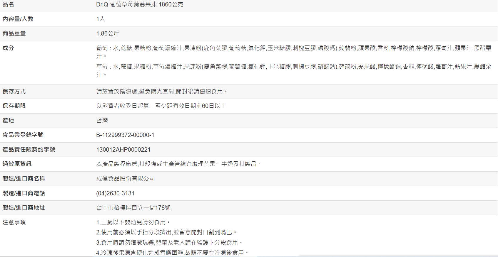【好市多代購】盛香珍 Dr.Q 葡萄草莓蒟蒻果凍 1.86公斤