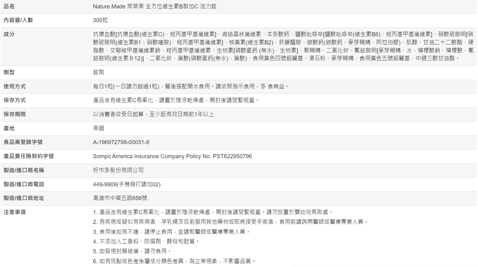 【好市多代購】Nature Made 萊萃美 全方位維生素B群加C 活力錠 300粒 Nature Made