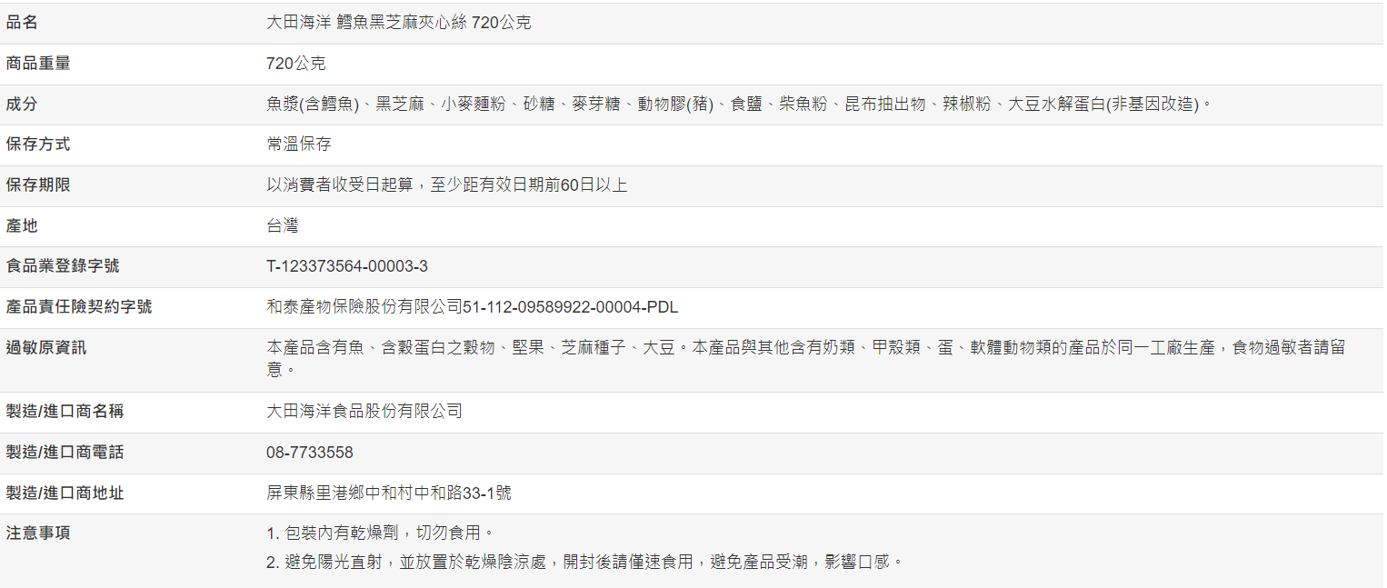 【好市多代購】大田海洋 鱈魚黑芝麻夾心絲 720公克
