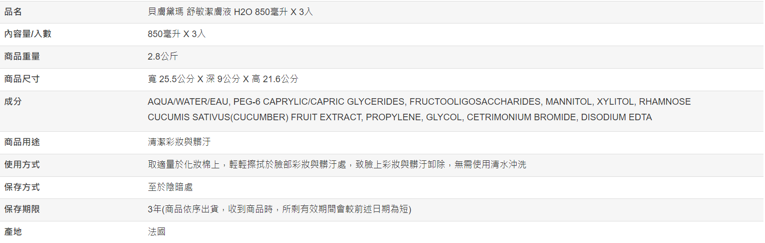 【好市多代購】貝膚黛瑪 舒敏高效潔膚液 H2O 850毫升 X 3入