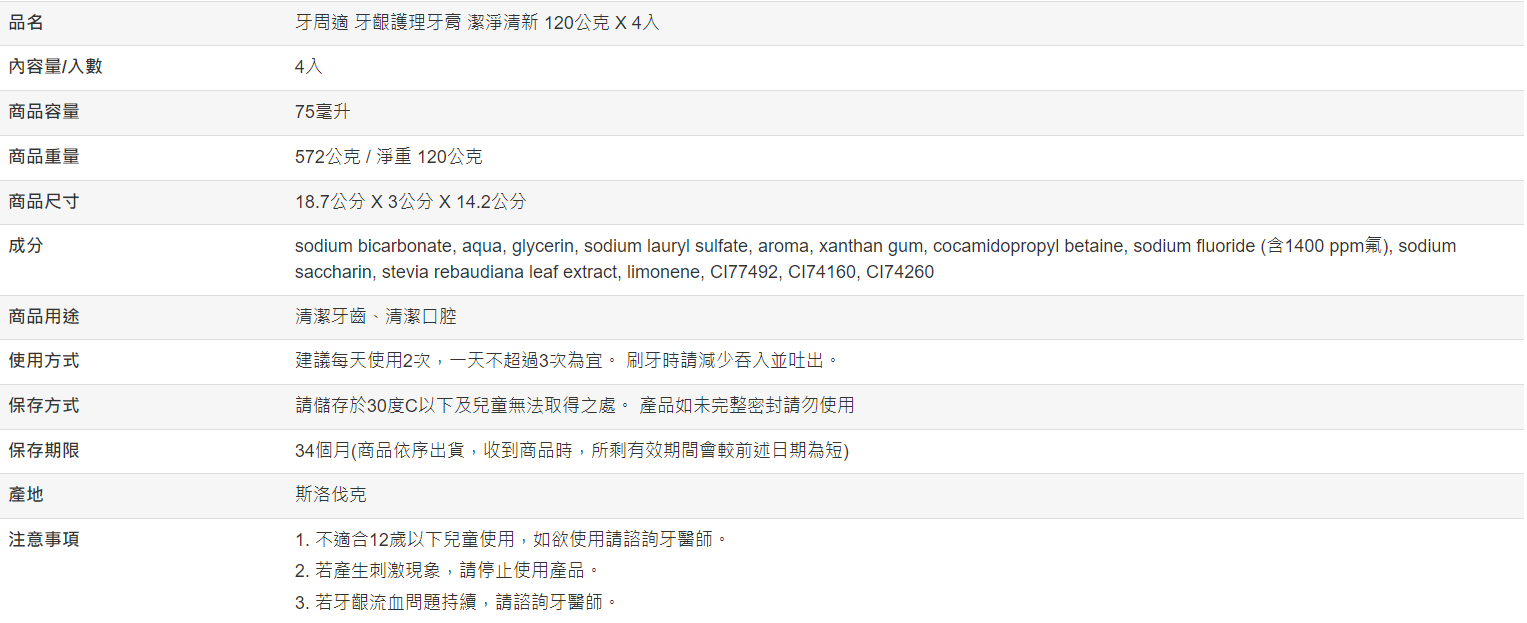 【好市多代購#限時特價】牙周適 牙齦護理牙膏 潔淨清新 120公克 X 4入~04/12