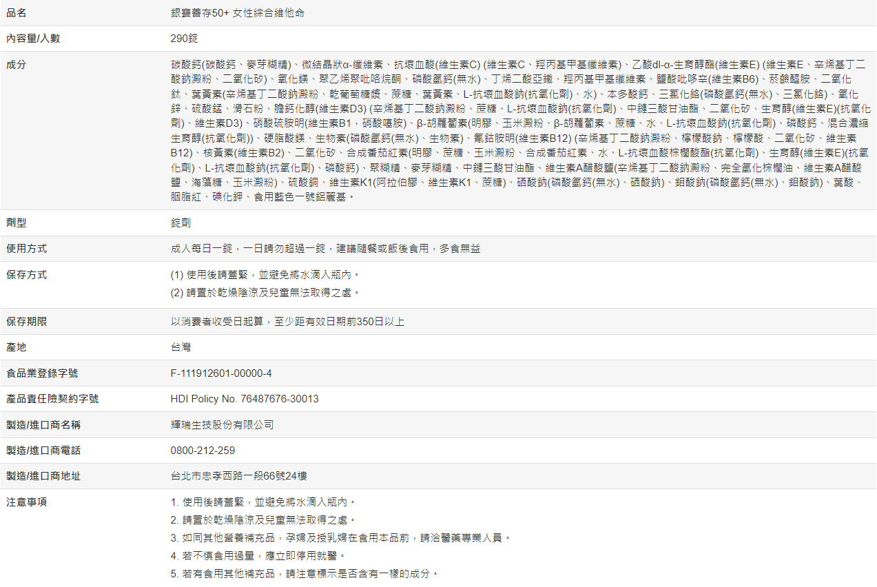 【好市多代購】銀寶善存50+ 女性綜合維他命 290錠