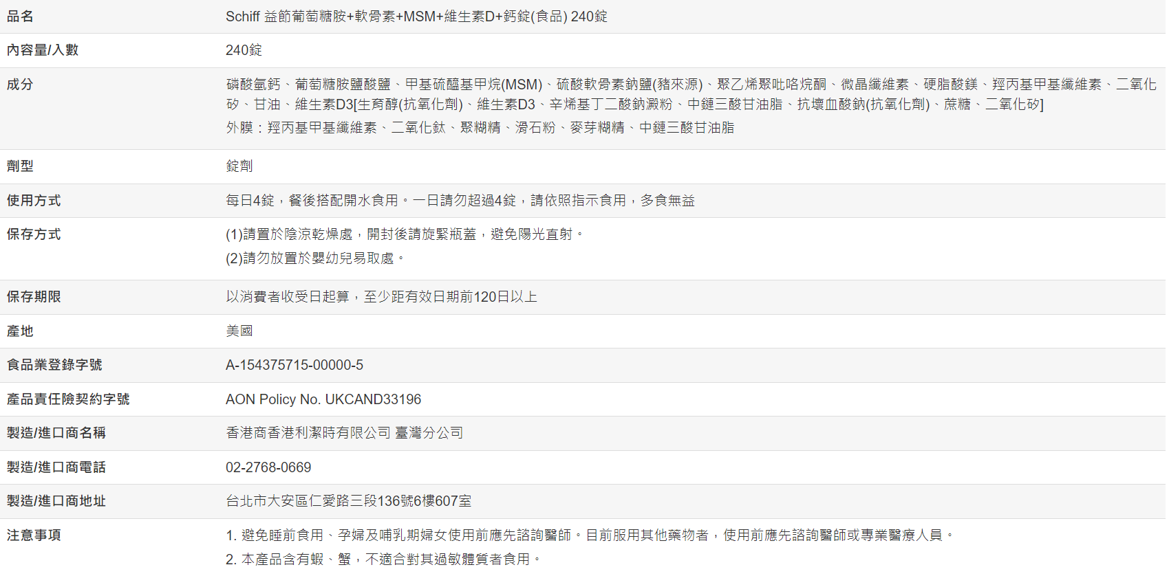 • 每份(4錠)含軟骨素(豬來源)600毫克