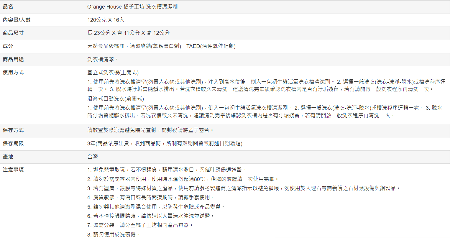 【好市多代購】橘子工坊 洗衣槽清潔劑 120公克 X 16入