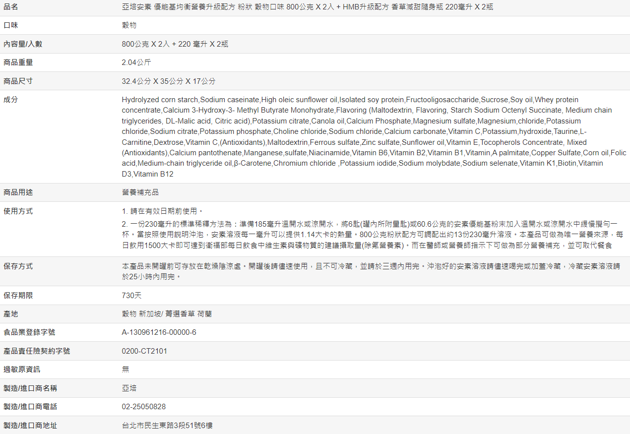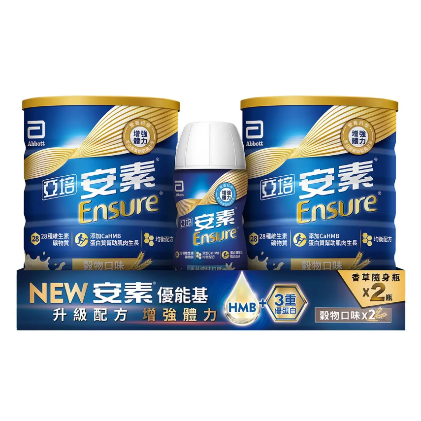 【好市多代購】亞培安素 優能基均衡營養升級配方粉狀穀物口味800gX2入+HMB升級配方香草減甜隨身瓶220mlX2瓶