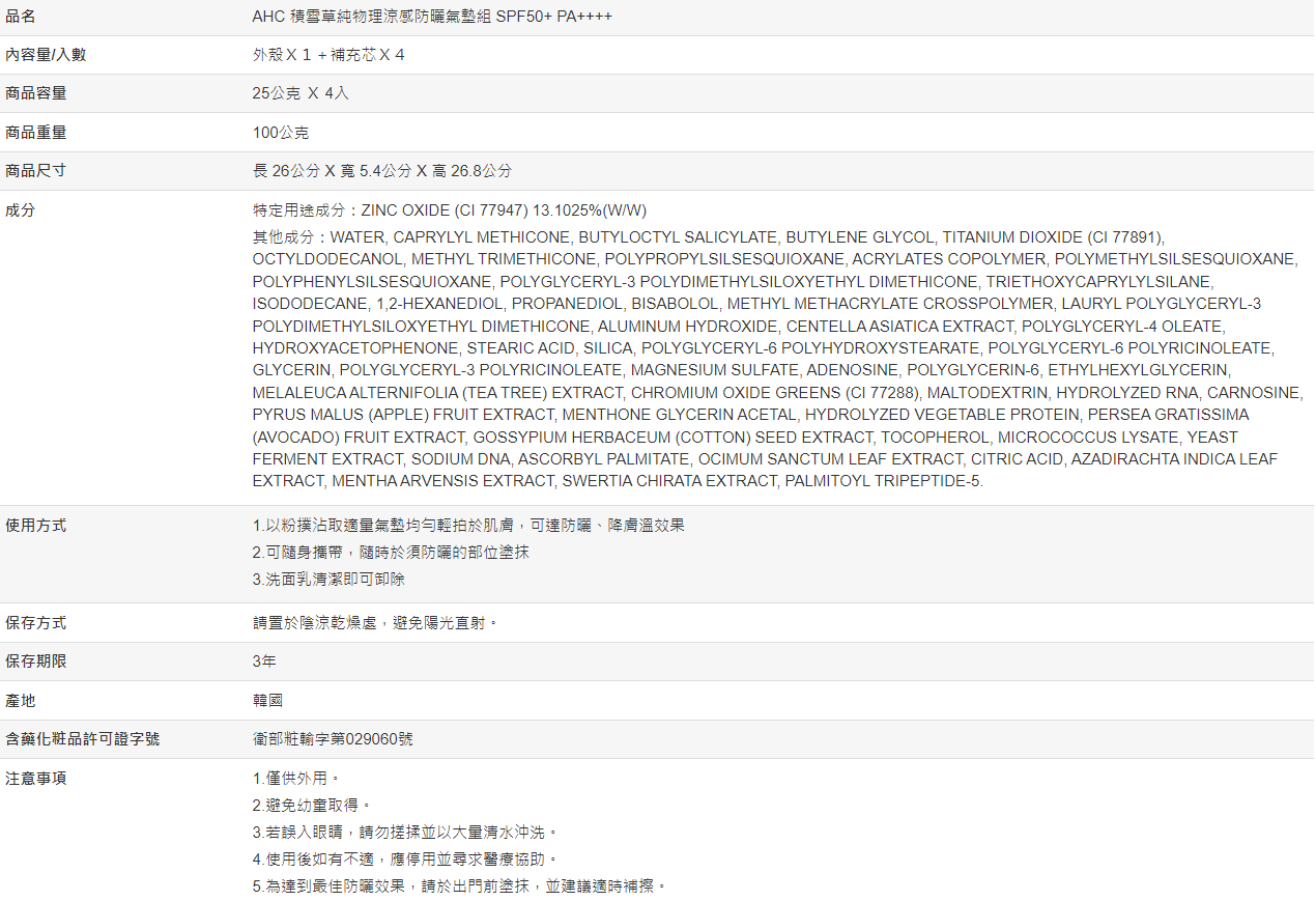 【好市多代購】AHC 積雪草純物理涼感防曬氣墊組 SPF50+ PA++++