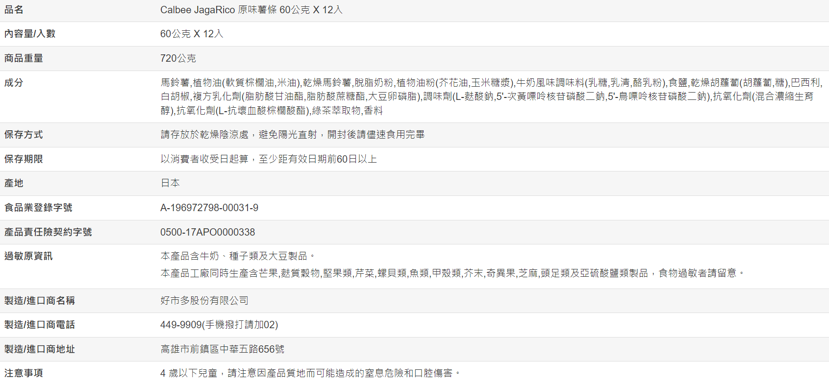 【好市多代購】Calbee JagaRico 原味薯條 60公克 X 12入
