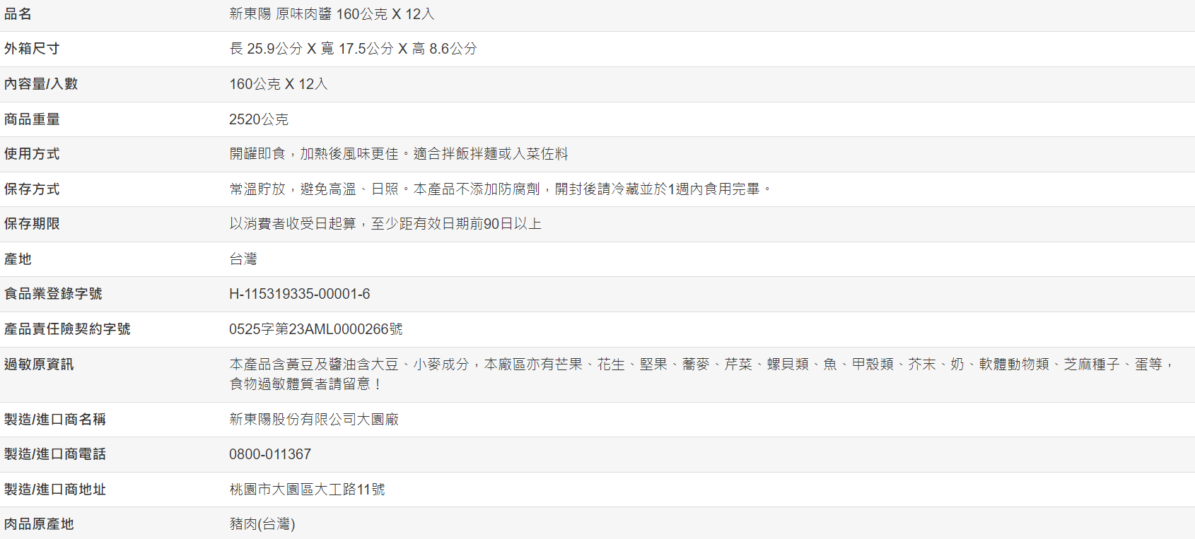 【好市多代購】新東陽 原味肉醬 160公克 X 12入