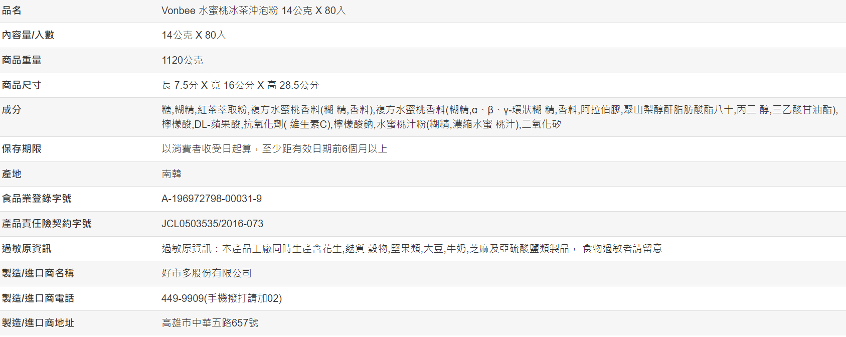 【好市多代購】Vonbee 水蜜桃冰茶沖泡粉 14公克 X 80入