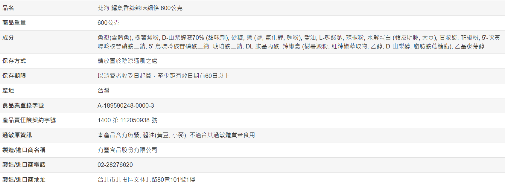【好市多代購】北海 鱈魚香絲辣味細條 600公克